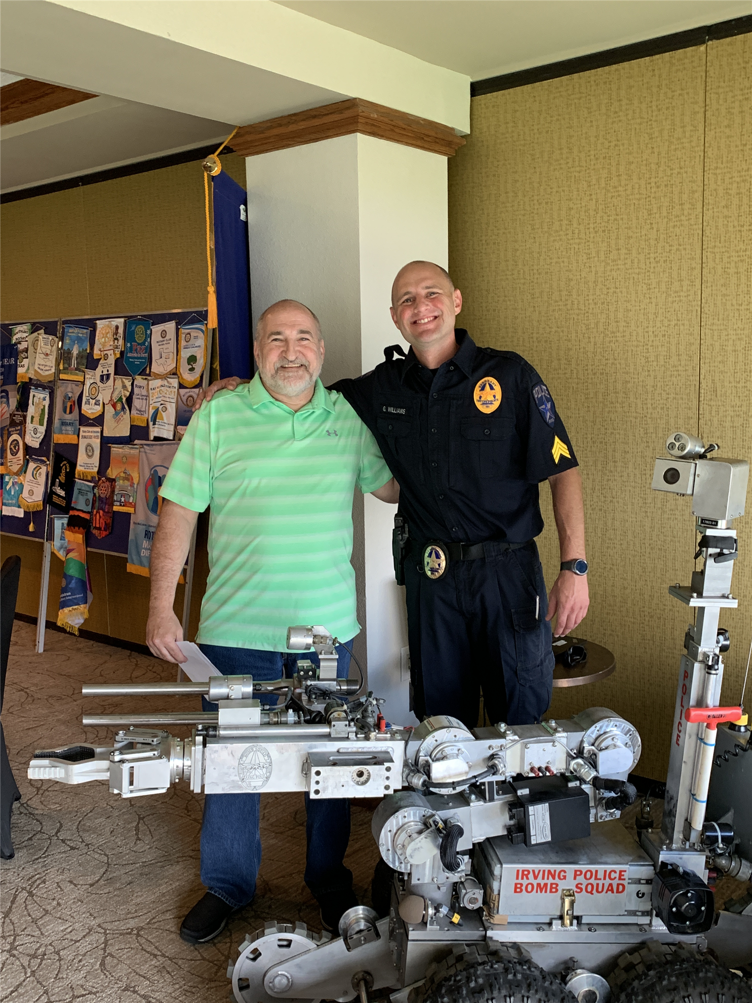 Sgt. Grant Williams of the Irving, Texas Police Department’s Bomb Squad, enlightened the Southlake Rotary Club about the perils involved with detecting IEDs, explosives, explosive chemicals, pyrotechnics and ammunition on June 7, 2019. Sgt. Williams brought with him the Bomb Squad’s bomb robot, which was VERY COOL – as well as a VERY heavy bomb suit (perhaps 80-100 lbs.?). A bomb suit, also known as a blast suit, is a heavy suit of body armor designed to withstand the pressure generated by a bomb and any fragments the bomb may produce. The bomb suit was fun to look at and touch --- yet entirely sobering when you consider that an actual living person must put himself/herself within the confines of this undoubtedly oppressive and scorching ensemble while trying to disarm an explosive! As an officer of the Bomb Squad, we want to thank Sgt. Williams for his wonderful and informative presentation, as well as applaud him for keeping our community/world safe. He and his colleagues put their very lives at risk for public safety --- so give a big THANK YOU to first responders and others serving and sacrificing for our country today! #wearerotary #peopleofaction #rotaryconnectstheworld.